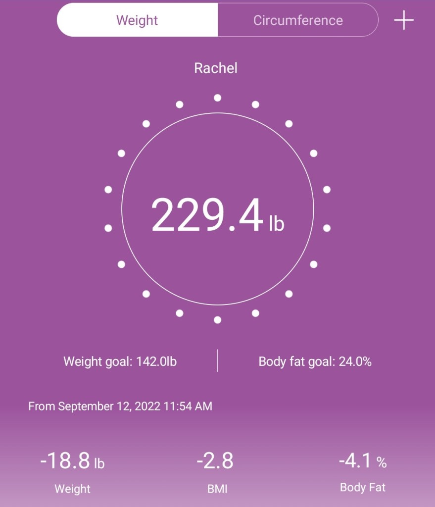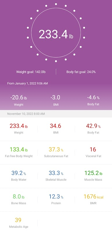 I actually have my weight recorded at the beginning of August as 252! Meaning that my nearly 20lbs has come from the past few months, In September I hit 248, and in October I hit 237. Now that it’s November I’m weighing in at 233. The last time I weighed anything close to this was in 2019 when I had complications from my gallbladder surgery, and before that was when I was living in Barcelona where I walked everywhere and ate much fresher food.